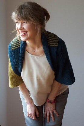 Easy to knit, multifunctional and interesting to look at – that’s the kind of knitting project that I am most fond of these days! Shrug & More was designed as a garter stitch shrug, but the arm openings are intentionally big enough to fit over your head – which creates endless possibilities to wear! The short-row shaping of the collar and one two-tone sleeve make it an interesting piece of your wardrobe. The yarn I chose is a certified organic ultrasoft merino which is a true pleasure to have next to your skin.