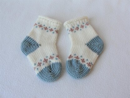 Sweet little color work sock pattern for baby boys and girls. Seamless styled toes and heels. Quick and easy little accessory to coordinate with unisex outfits. A fun and useful way to use up small bits of yarn. Two cuff rib options are included.