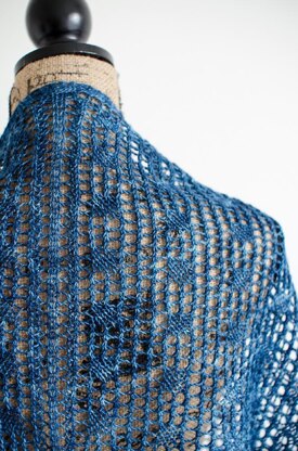 SIDEREAL is knitted in one piece from the top down. Tiny diamonds grow symmetrically off the spine of the shawl on the mesh ground. The main body is framed with a wide band of garter that beautifully offsets the negative space and highlights its delicate gauzy fabric. The shawl is knitted in a 3-ply fingering weight yarn with an excellent stitch definition in semi-solid Cobalt Blue and reminds me of a starry night sky.