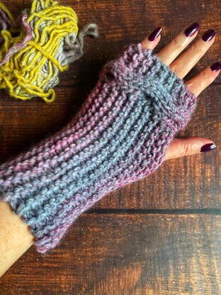 These stylish looking fingerless mittens are knit sideways - mostly in garter stitch and with a pretty, and easy to knit, cable detail at the top.