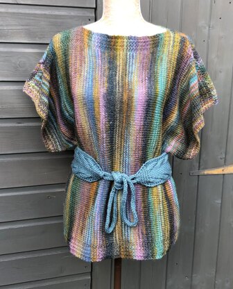 A beautiful sideways knitted top, worked in a stunning lightweight aran, combines to make this stylish design. The top is worked in 2 pieces and is designed mostly in st st with simple broken rib borders worked in one with the back and front, so no borders to sew on. The optional belt gives a stylish look, but the top is easily worn alone too. Full written instructions given.