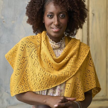 THIS SHAWL is formed from three wedges, which helps it to sit nicely on the shoulders. It’s knitted in stocking stitch with a pattern of stylised leaves and flowers; the lace becomes more intricate towards the bottom of the shawl. Sandra Nesbitt’s design uses the soft and silky Exquisite 4ply yarn from West Yorkshire Spinners.