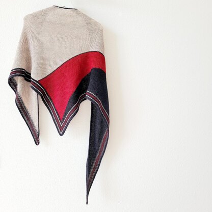 This shawl is knitted in garter stitch in segments. You will start with color 1 and create an asymmetric triangle (I). Using color 2 you will pick up stitches and work short rows resulting in a wedge (II). With color 3 a second wedge will be created in the opposite direction (III). If you like a small version, you can work the finishing I-Cord or for a bigger shawl a border (IV) and an I-Cord will finalize this shawl. This pattern is written for fingering weight yarn and yarn consumption and sizes are referred to this yarn weight.