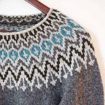 Inspired by traditional Icelandic lopapeysur, Sigrún is knit seamlessly in the round from the bottom up. The stranded, circular yoke is finished with an applied i-cord neckline. Dk or sport weight yarn. Designed to be worn with 1-4” / 2.5-10 cm positive ease. Shown in size C (39.5" / 100.6 cm) with 3” / 5 cm positive ease.