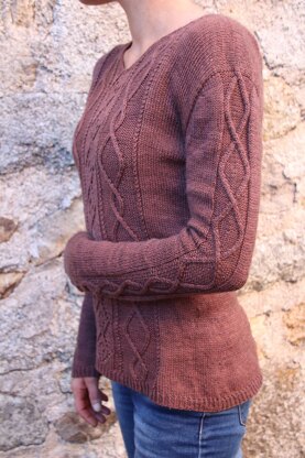 The sweater is knitted from top down seamlessly. You will start with the back in two parts that you will join to work to the armholes. Then you will put the back stitches on holder to work the front in the same way as the back, and finally you will join the back and front to work in round until the end. The sleeves will be knitted in the round, by picking stitches around the armhole.