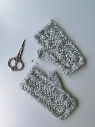 Cozy and warm mittens with a simple lace panel on the front. The mitts are worked with mohair and fingering weight yarn held together. A double start cast on is used to make a perfectly stretchy cuff with a garter stitch band instead of a traditional ribbed cuff. The lace pattern is worked for a few rows before starting the thumb gusset to allow for a longer and cozier mitten. The thumb is picked up and worked after the body of the mitten is completed. The top of the mitten and thumb also has a garter stitch band.