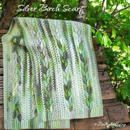 The Silver Birch Scarf is created using short rows and slip-stitch variations, combined with full-length lacy rows, and is smoothly integrated into the ribbing edges.