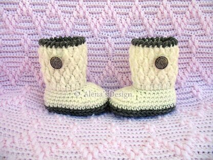 The booties are worked in one piece from sole up to top on the rounds. The high top of boot is worked back and forth on the rounds. Includes PATTERN for the Silver Button Baby Booties in four sizes: