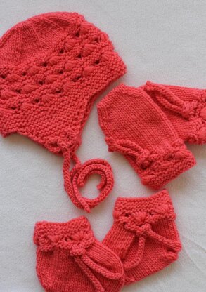 Each item in this set has a patterning reminiscent of sea shells. It is a repeat of six stitches and is easy to memorise. Each item is seamless for baby's comfort.