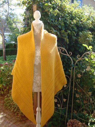 Lovely warm and large triangular shawl with a small twist. You can knit this shawl on circulars, but also on straight needles as long as they are about 15 inch / 38 cm long. The border pattern is divided in two parts and both parts are knitted separately creating a double ‘point’ or swallow tail design feature at the bottom of the shawl. Only simple stitches are used to create the pattern; knit, purl and yarn over. Because it’s bulky yarn you can knit this shawl in a reasonably short time.