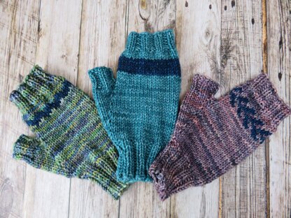 These cozy mitts in worsted weight yarn take just a couple of hours to finish and make a great gift. Choose from an undulating stripe in a slipped stitch pattern, a solid stripe, or a simple colorwork stripe. The stripes are a great way to use up your leftover bits of yarn from other projects. The mitts can be worked on either double pointed needles or a long circular.