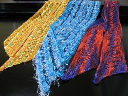The scarves in the picture were all knitted using US 10.5 (6.5 mm) needles and three different yarns. In each case one skein of yarn was used.