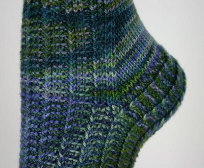 A sock suitable for men or women, with a gusset and patterned heel flap.