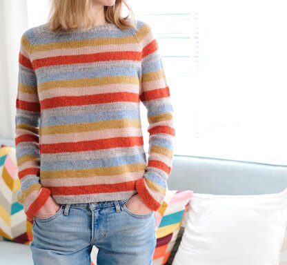 This simple striped sweater is a perfect stashbuster. It’s worked from top down using fingering weight yarn in five colors.