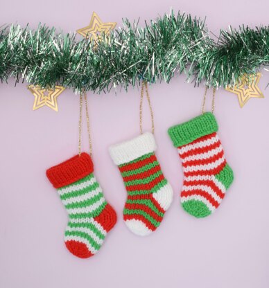 Step into Christmas with this festive footwear! Unlike traditional stockings, these mini makes are knitted flat, using only one colour at a time, with no fiddly fair isle or intricate intarsia. Measuring a teeny-tiny 10cm/4in from cuff to toe and using just 7g/¼oz of yarn, they can easily be completed in an evening, making them ideal for gifts, decorations and fundraising. Alternatively, why not knit a drawer full and turn your stock of socks into an heirloom advent calendar.