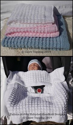 Knitting pattern for 3 super easy blankets to knit - one to fit a large traditional pram, one for a smaller modern pram and one to fit a standard size car seat. Suitable even for beginners this lovely waffle style pattern knits up quickly and easily and keeps baby lovely and cosy as the texture makes it lovely and warm.