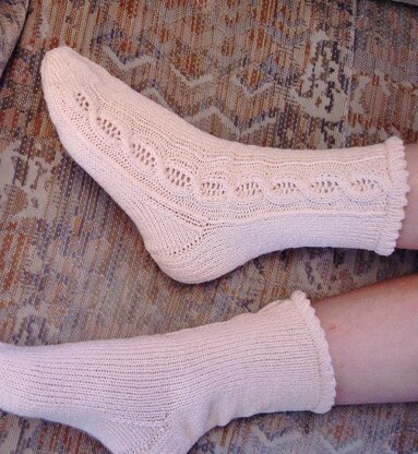 Description: These socks are knit top-down, the socks are completely mirrored, but there are no instructions for heel and toe, you can make these as you wish. The pattern is also suitable for beginners, but some experience in sock knitting is needed. The pattern contains charts for small socks (56 stitches) and for women’s medium socks (64 stitches).