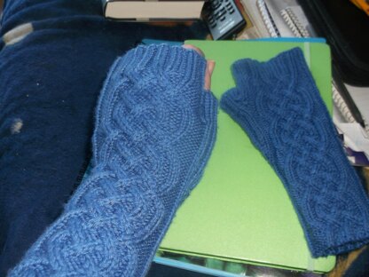 The Single Jig Mitties came about as I was working on the Single Jig Mittens. They use the same cables and have the same longer cuff that fits nicely into the sleeves of a light jacket or even your winter coat if you just want a little something on your hands. The mitties are fingerless mitts but I’ve made them a bit longer on the fingers as I find them more comfortable walking with a cane; they don’t curl under and catch at my cane head the way other pairs seem inclined to doing.