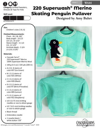 Skating Penguin Pullover in Cascade Yarns 220 Superwash Merino - W644 - Downloadable PDF is a free Intermediate Knitting pattern by Amy Bahrt, available as a Downloadable PDF and includes instructions in English. Super fun to make, this pattern could be your next masterpiece!
