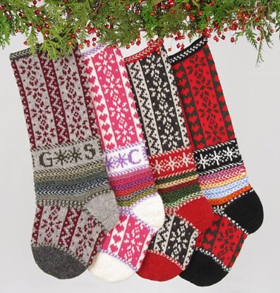 Pattern provides clear written insructions, along wtih color charts for each colorway, to knit a Christmas stocking in the round.