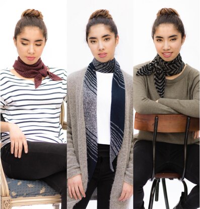 The pattern trio includes 3 options, a chevron stripe (SS No 1), a clean-edged lace (SS No 2), and a more abstract diagonal stripe (SS No 3). Each pattern requires only about 260 yds of fingering-weight yarn, so they’re perfect stash busters. I suggest going pure lux and using the Woolfolk…if you haven’t worked with this yarn before, you won’t believe how soft, cushy yet lightweight it is.