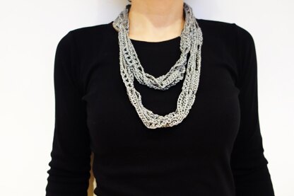 This simple and elegant skinny scarf/necklace is made of crochet strings attached together through working double crochet stitches.