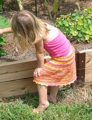 This skirt was born of a desire to have a workhorse garment that was highly washable, durable, not expensive to make, and simple to knit. It’s the kind of thing you won’t feel bad about knitting every year after the annual growth spurt. The natural striping of the yarn means you don’t need much in the way of a stitch pattern – just the little detail of garter stitch pinstripes that “melt” into a picot bindoff. It’s like a popsicle and a skirt at the same time – the perfect summer combo!