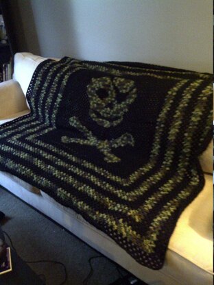 The square with the skull in the middle is solid. The background and border are made out of a granny square type sequence to allow for faster completion time.
