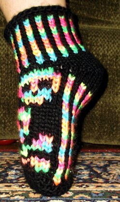 This pattern is created using colorworks. It is for adult size only, and I used the CInDWood loom 30peg 1/2 gauge to do it. I used 1 skein of black and 1 skein of neon multi color, but I split the 3 strands that make 1 strand into seperate skeins to make 1 ball that was 3 times as long as 40 yards. I need 1 skien of each. Because it is still a pretty fat yarn after you split it a bulky yarn will do just fine for the project. It is written with graphing for the color works section and has a link to the video tutorial that will help with the toe and heel section.