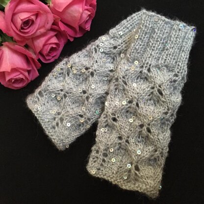 These deceptively simple fingerless mitts are knit flat and seamed together to form a discrete thumb hole opening. They can also be worn as wrist-warmers, leaving your hands free. Made from glamorous sequinned yarn, they are perfect for a special occasion and make a beautiful accompaniment to the Sky Full of Stars (multi-way) Shrug which uses the same stitch pattern.