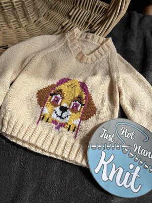Knitted in DK or 8ply, the jumper is worked in pieces, then sewn together at the end. The collar is then added using DPNs or a circular needle. Skye is created using intarsia, and the pattern includes a chart plus full written instructions. However, you could embroider her instead.