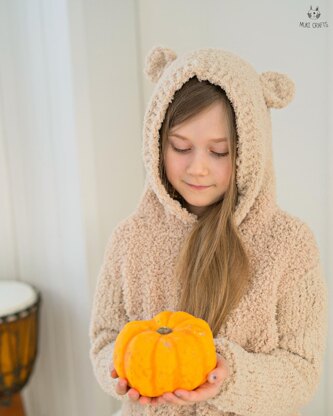 Thehe adorable Skylar bear cardigan knitting pattern, a cozy and chunky addition to any child's wardrobe! This delightful hooded sweater is designed with a big pocket and rounded ears, bringing an extra touch of cuteness to your little one's style.