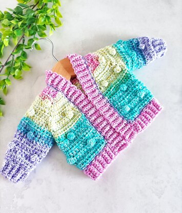 This cute bobble cardigan is made from the top down, using a simple half double crochet (half treble crochet UK) stitch and bobble stitch, it is quick and easy to work up.