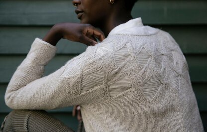 Skylight is knitted top down seamlessly beginning with a provisional cast-on. The main fabric is worked in Stockinette Stitch. Short row shaping in the yoke occurs before and after the main cabled patterning. The cable and drop stitch pattern wraps all the way around the yoke.