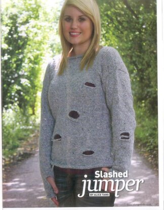 Slashes are made to match self slashed jeans. The fit is easy, simple rectangle body and square sleeves. Each knitter can customize their sweater with their own choice of slashes.