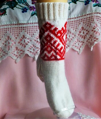 These are knitted socks in ethnic style. They are decorated with a pattern of traditional Russian embroidery. These patterns protect their owner, are used as a talisman.
