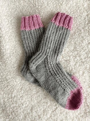 Yarn MC: 125yd {~75g} worsted weight for sock leg and foot I used Lion Brand Wool Ease in Gray Heather CC: 40yd {~25g} worsted weight for cuff and toe I used Basic Stitch Anti-Pilling in Prism