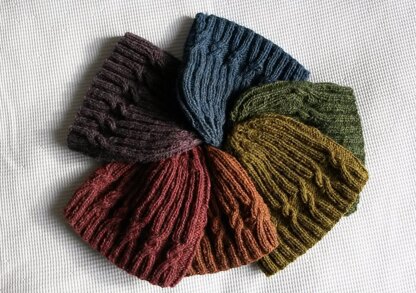 In this beanie hat design, the cable detail starts slightly higher on each column, creating a subtle spiral detail. It makes it a little different from standard hats, while still being a very wearable twist on a standard Aran motif.
