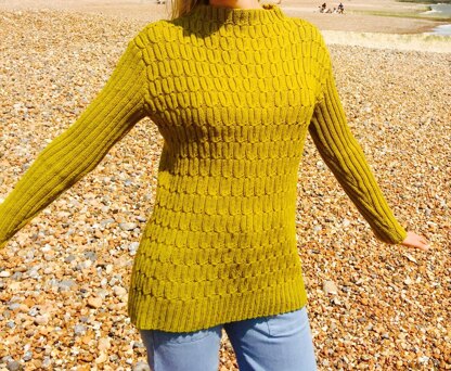 This sweater which is knitted in a striking Chartreuse shade is perfect for the winter months as the smocked stitch gives a nice warm texture to the garment.