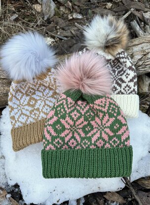 The SnoStorm Snowflake Beanie is a slightly slouchy fit hat with a single rib double brim that is super cute and fun to knit. The double brim allows the beanie to fit varying head sizes.