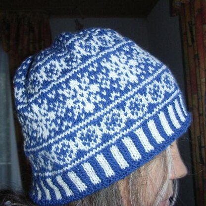 My second last christmas pattern for 2012: the snow chrystal beanie. It is a two-colored beanie with a two color (corrugated) ribbing. It has a nice little snowflake border pattern and a big snowflake or snow crystal in the middle. At the top are tiny and a big snowflake(s).