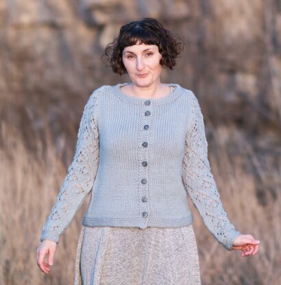 Intermediate • Top down • Raglan yoke • Knit-in bands • Lace sleeves Yarn Weight 5