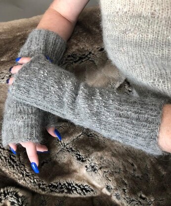 These mid-forearm length mitts are worked in the round from the upper ribbed cuff to the hand opening. They are decorated with a beaded snowflake pattern on the back of the hands, which runs up the arm. The palm of the mitts is worked in a 2/1 ribbing. The thumb is shaped with a gusset, and the thumb stitches are worked in ribbing as well.