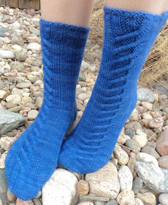 The snow in Colorado tends to be dry snow, light and powdery. And the wind blows all the time. The cables on these socks sweep the garter stitch across the leg and foot, like the wind swirling the snow through the air and across the ground.