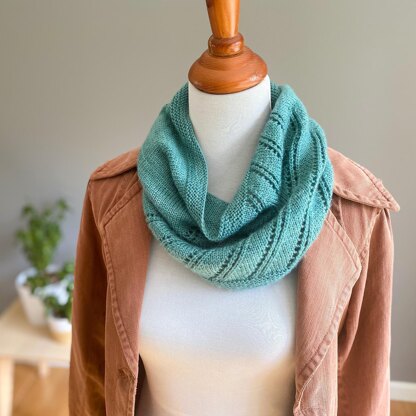Do you have 1 skein of fingering or sport-weight yarn that needs a small something-special project? Snowdrop may be just the thing! This 1-skein cowl in Manos del Uruguay [Alegria][1] is a light and airy accessory perfect for any climate. The diagonal lines of eyelet stitches are featured on just one side of the cowl for an asymmetrical, modern twist that’s easy and interesting to knit.