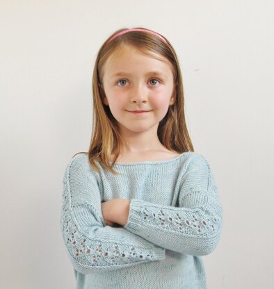 This sweet pullover has an unusual construction. It is worked seamlessly from the bottom up. The body is worked in the round to the underarms, where the front and back are separated and worked back and forth. Stitches are then cast on for the shoulder and the shoulders are worked back and forth in the snowdrop pattern, joining the front to the back. More stitches are then picked up for the sleeves which are worked in the round, while continuing with the snowdrop pattern. the neckline is finished neatly with an i-cord bind off.
