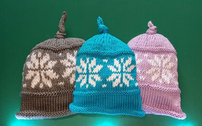 After watching the rain beat at the windows yet again, I wished the raindrops would turn into snowflakes, which made me think of Christmas. I'd been wondering what to knit for Christmas for my grandniece and nephew, one aged 1 year and the other aged 1 month. That's when babies, hats and snowflakes came together in my mind. I was so pleased with the result that I wanted to share it.