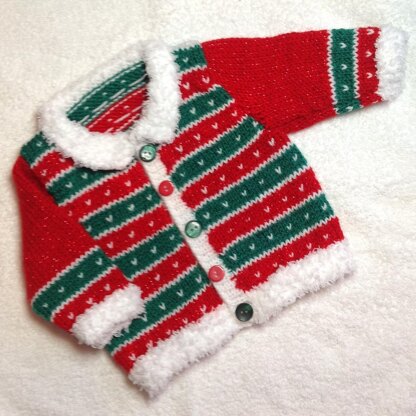Christmas sparkle with a snowflake collar looks wonderful for the festive season. This little cardigan sparkles so well. The white dashes are like falling snow. Worked in one piece to the armhole saving on seams. A writing pattern with the colours written in, no chart.