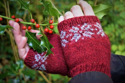 These are festive handwarmers that are perfect for the winter season and have beautiful snowflake fair isle detail. There is simple ribbing around the wrists, knuckles, and thumb hole.