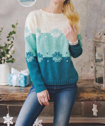 This is a pattern for a Snowflake Jumper, originally published in Simply Knitting. It has an ombre effect, witht he backgrounds changing colour. The motifs are knittd in fairisle, with intarsia between the motifs. Photos Simply Knitting.